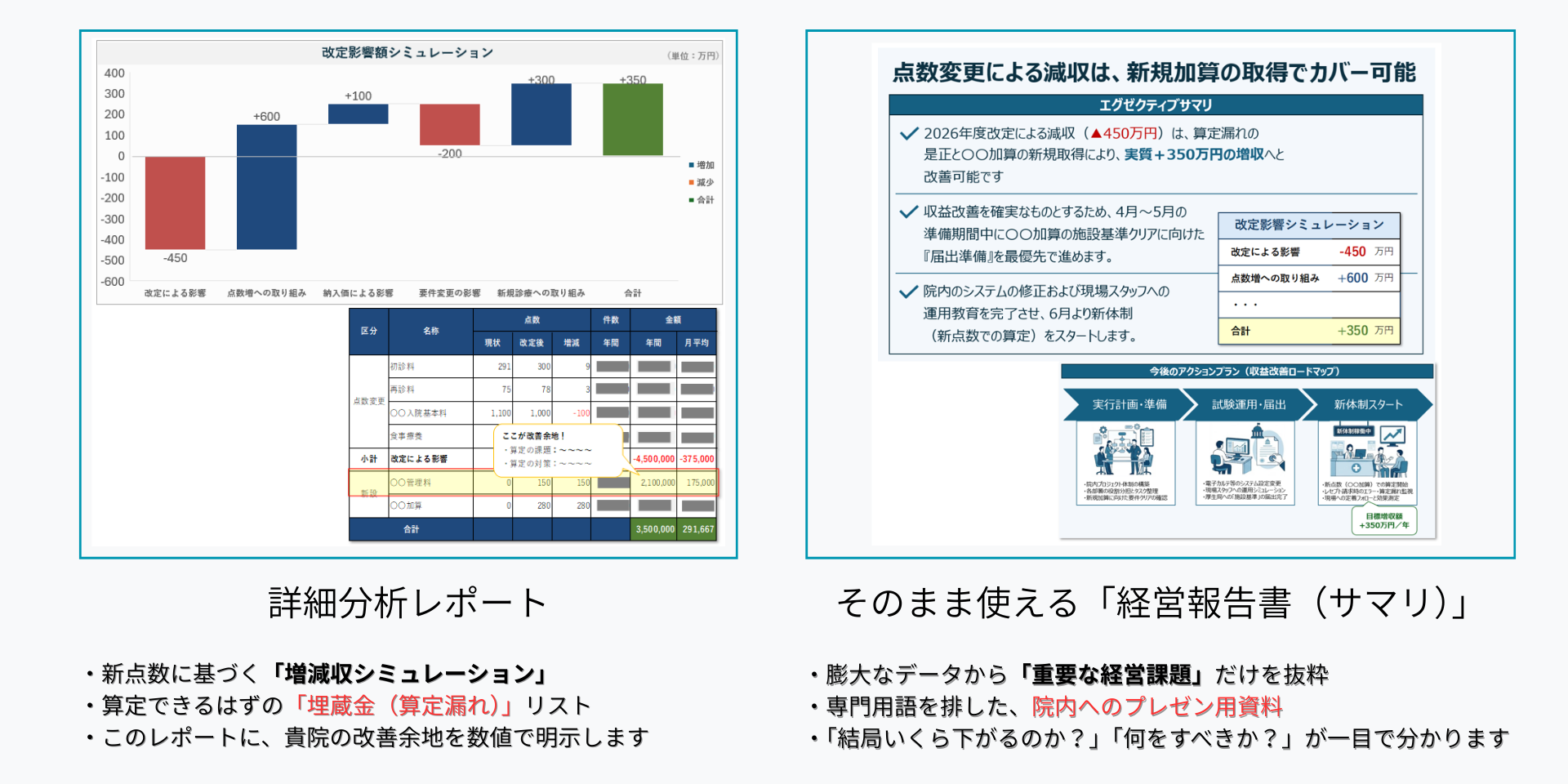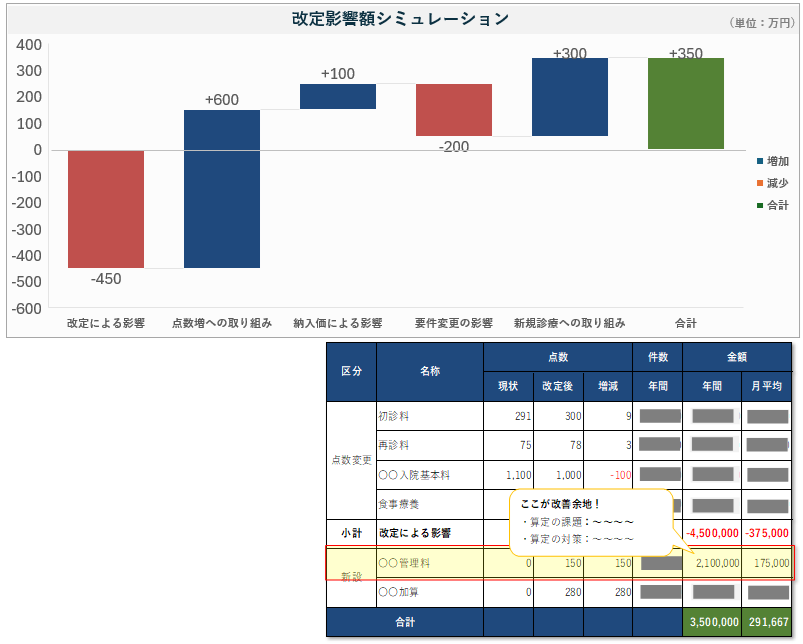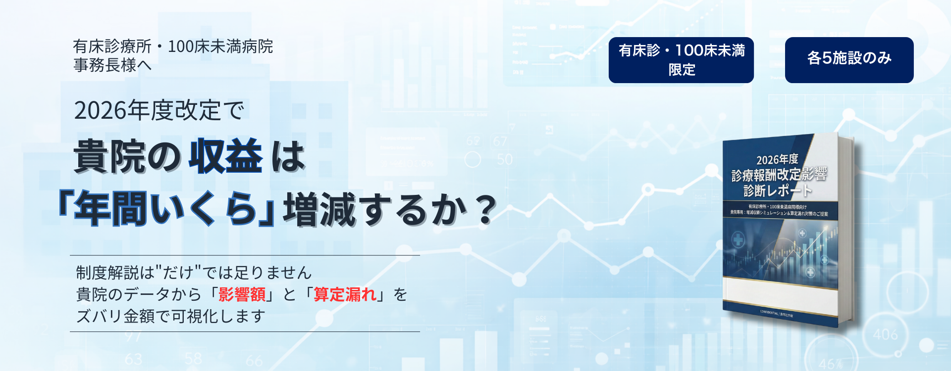 20~99床 改定影響を最も受ける層に特化 過去実績に基づく影響評価から新設項目のシミュレーションの監査まで対応します |