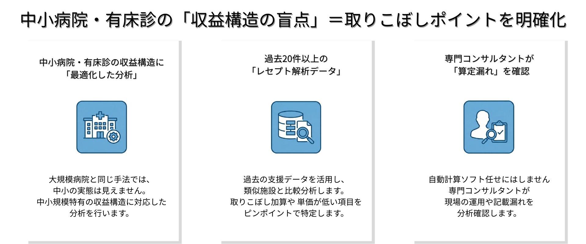 19床以下 有床診特有の要件に絞り込み、基本的な増減収シミュレーションと算定漏れのチェックを実施します